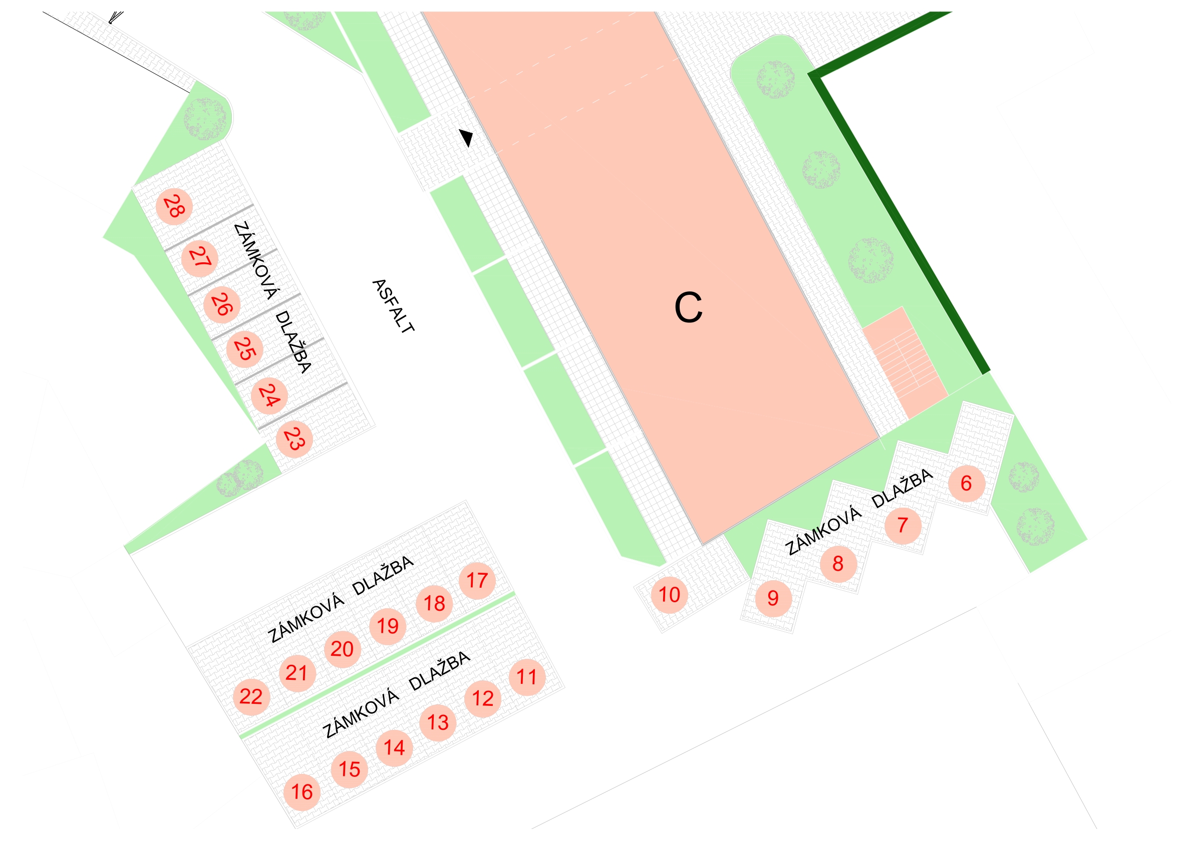 - Parkovací stání č. 28 – 2,5 x 5,0 m – bez přípravy pro EV – cena 295.000,- – K DISPOZICI
